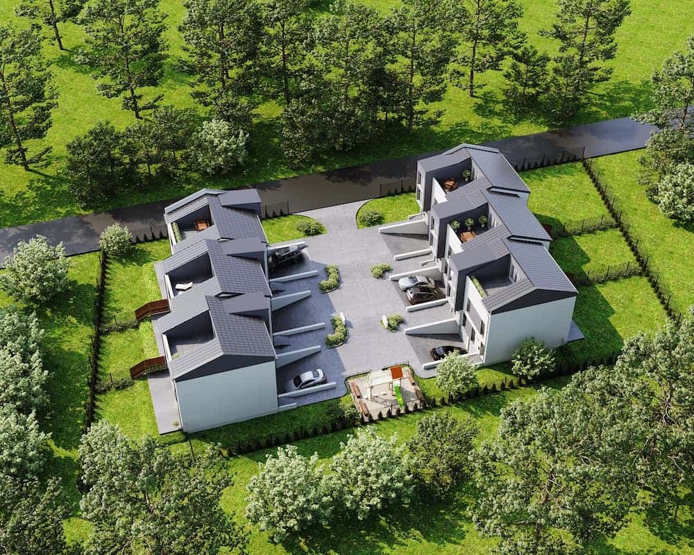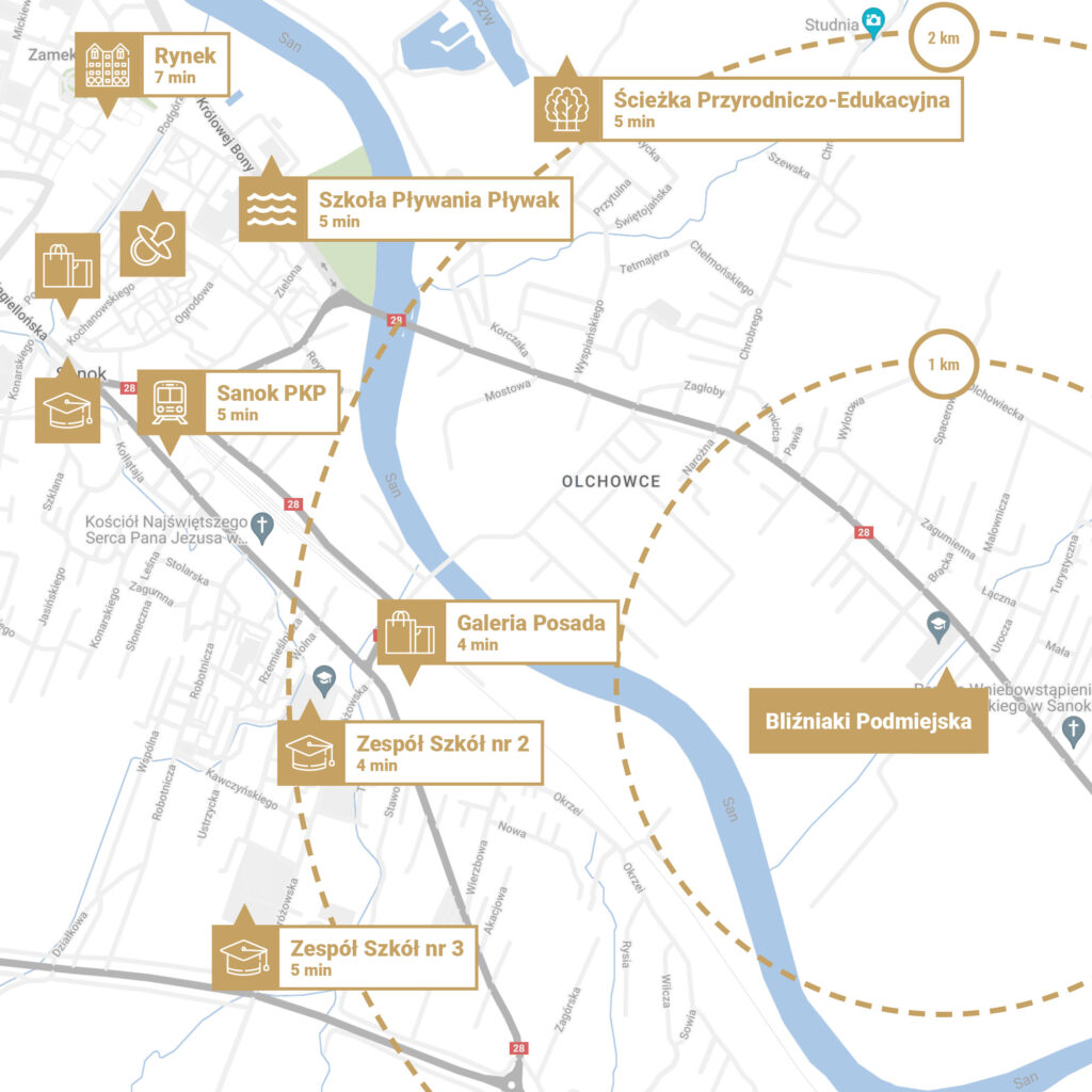 Inwestycja jest zlokalizowana w Sanoku, przy ul. Podmiejskiej – w odległości 3 km od samego serca miasta. Do rynku można dotrzeć samochodem w mniej niż 7 minut, korzystając z pobliskiej drogi krajowej nr 28. To znakomite rozwiązanie dla tych osób, które chcą pełnymi garściami czerpać z atutów dużego miasta, jednocześnie ciesząc się zdrowym klimatem zielonej okolicy.Rozwiń ∨