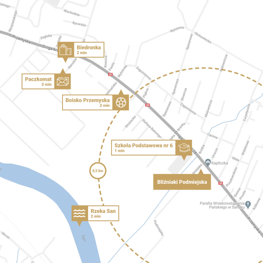 Jednym z największych atutów lokalizacji Bliźniaków Podmiejska jest cicha, bezpieczna i zielona okolica. Od zachodu mieszkańcy będą mogli cieszyć się pięknymi widokami rozległych lasów, otaczających nabrzeże Sanu – od samej rzeki inwestycja jest oddalona o ok. 700 metrów. Nie brakuje tutaj miejsca na długie spacery, bieganie czy rowerowe wycieczki. Niedaleko również inne atrakcyjne tereny rekreacyjne, takie jak: Sokoliki Park, Rezerwat Polanki, skatepark, plac zabaw, ścieżki przyrodniczo-edukacyjne, łowiska, Park Miejski im. Adama Mickiewicza, Kopiec Adama Mickiewicza czy Park Etnograficzny.Rozwiń ∨