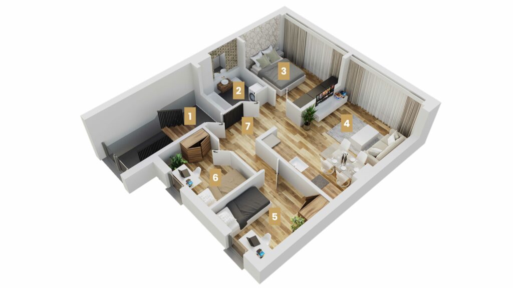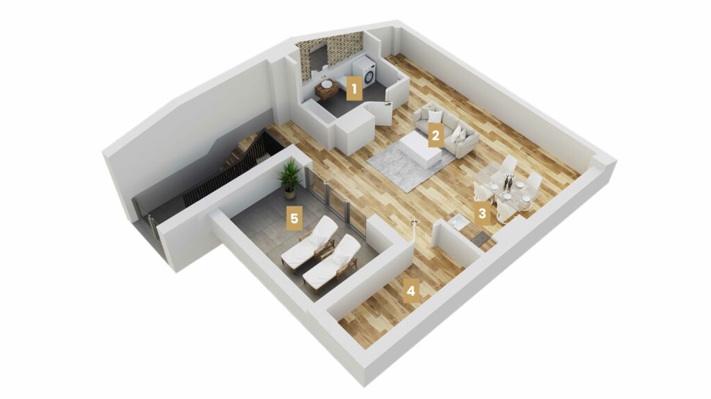Lokale na piętrze mają 196,43 m² i – oprócz czterech pokojów – posiadają poddasze użytkowe z pokojem gościnnym, który może być zaadaptowany na gabinet, siłownię, domowe SPA czy też dwie niezależne sypialnie. Mieszkania na piętrze mają także tarasy na dachu o powierzchni od 11,60 m² do 12,90 m². Zwiń ∧